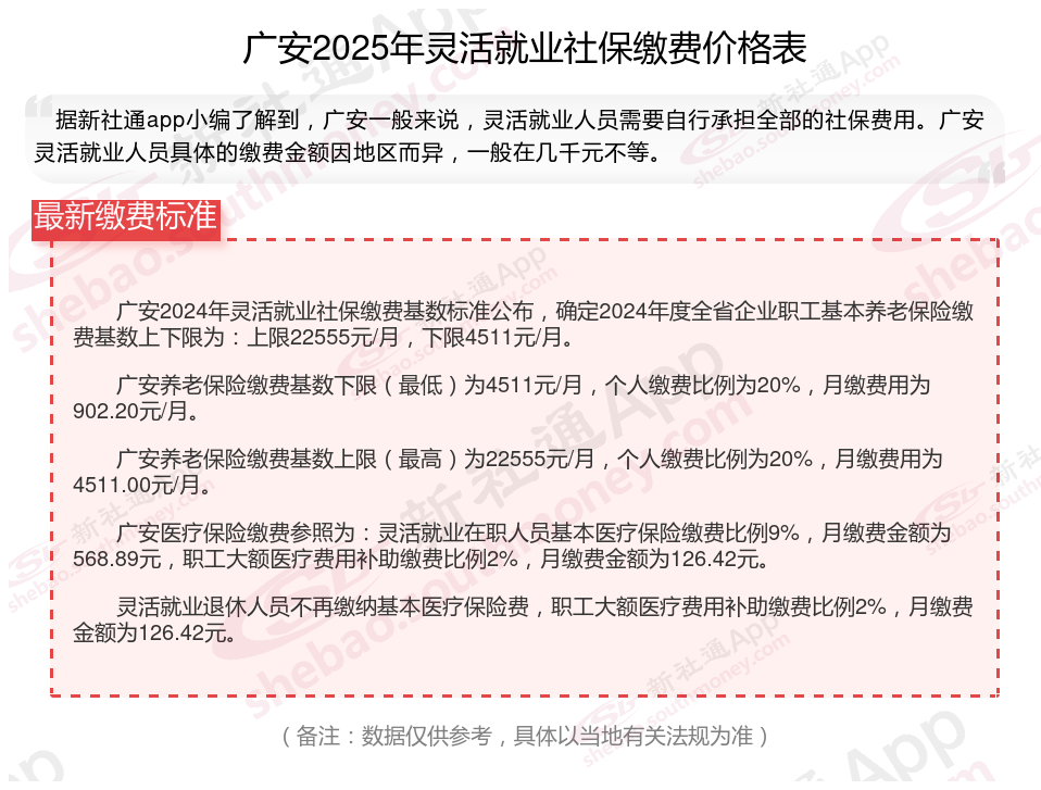 据新社通app数据显示,广安灵活就业养老缴费基数明细如下: