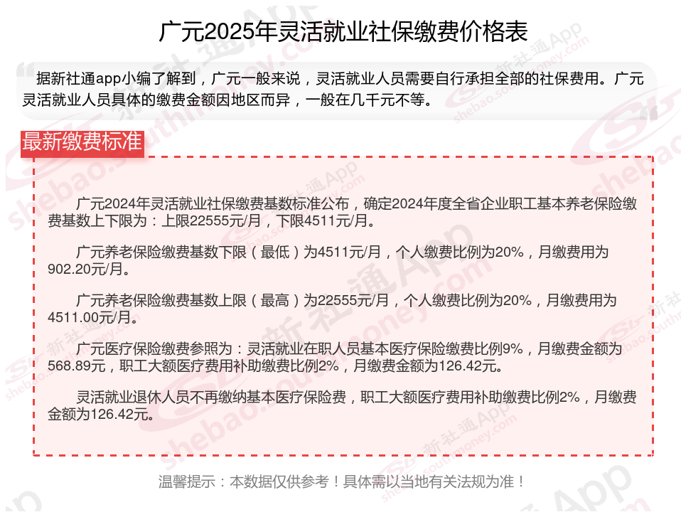 据新社通app数据显示,2024-2025年广元灵活就业人员养老保险的缴费标准是根据缴费基数来确定的: