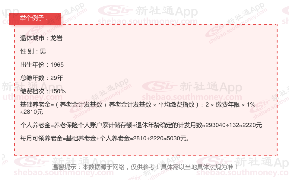退休城市:龙岩,性别:男,出生年份:1965,总缴年数29年,缴费档次:150%,新社通app养老金计算器所得: