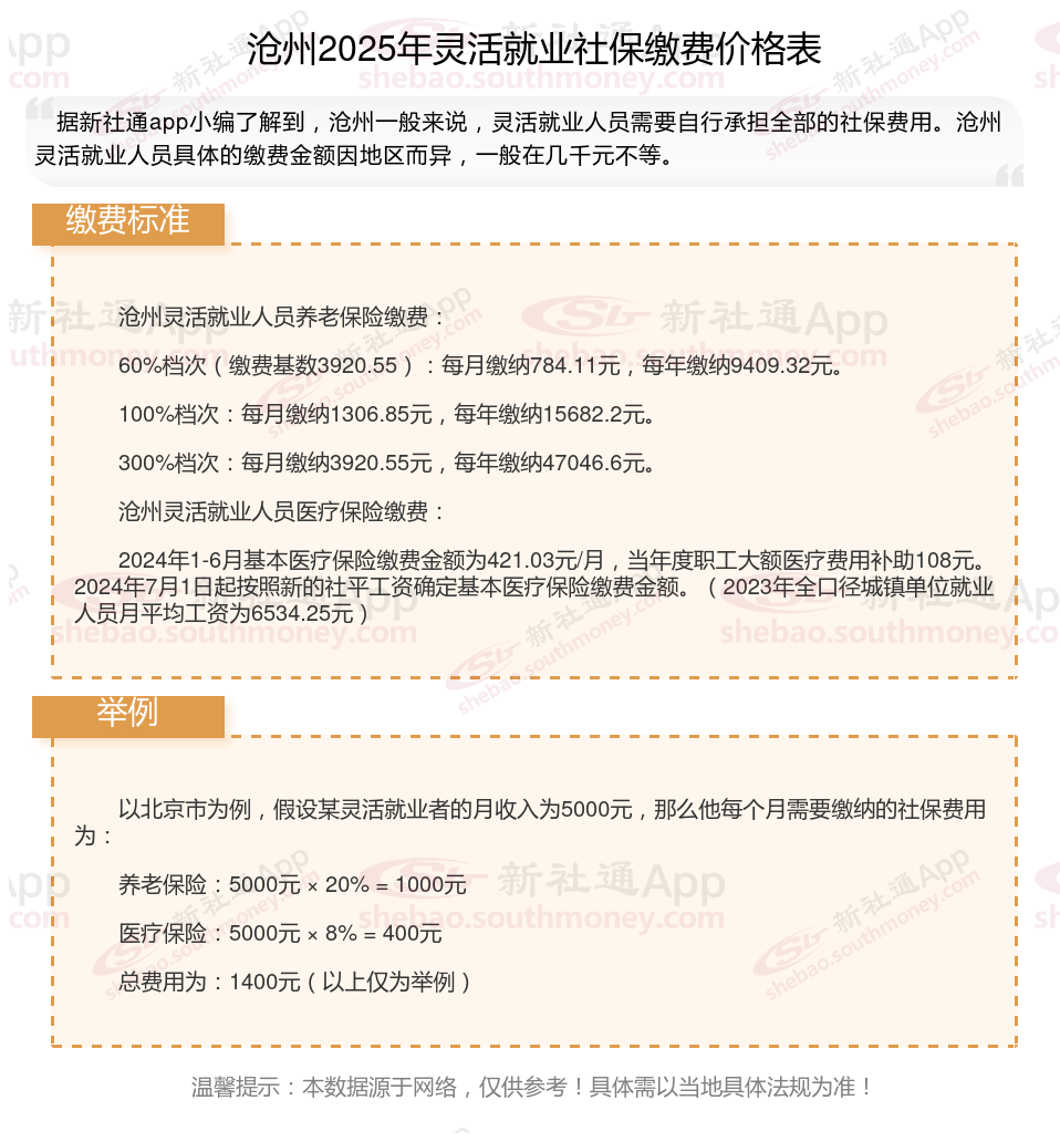 据新社通app数据显示,沧州灵活就业养老保险的缴费基数为:3920.55元。灵活就业人员参保缴费的比例为个人20%。