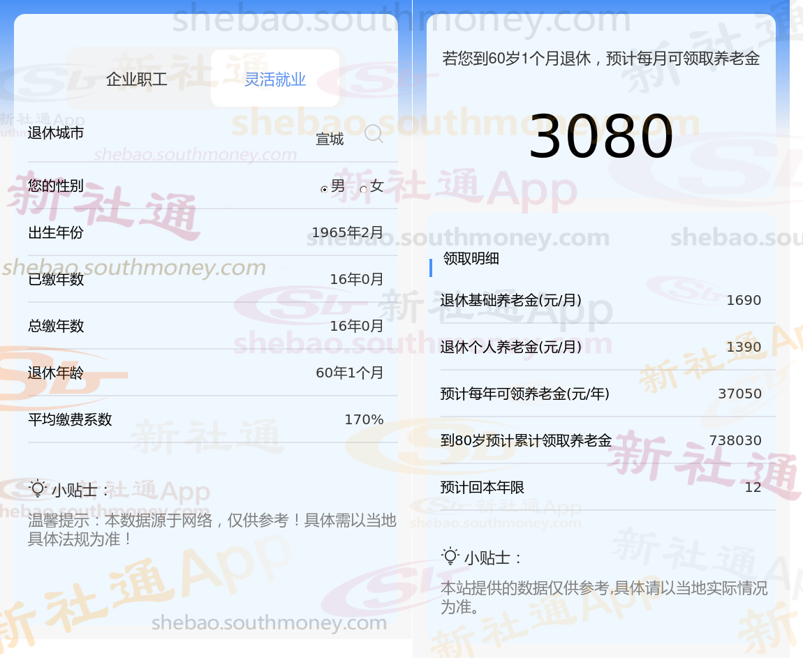 新社通app养老金计算器所得出,每月可以领取约3080元。