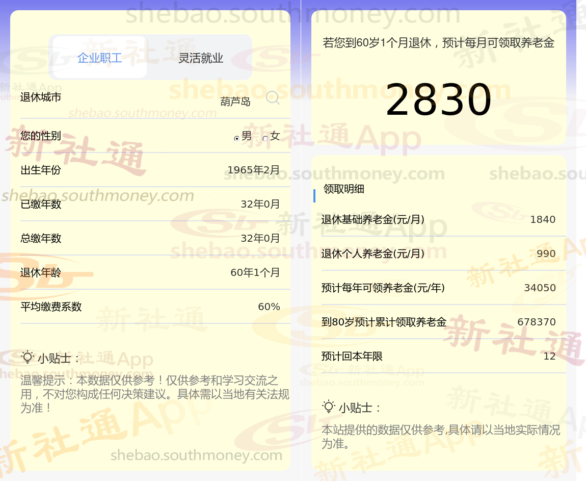 刘某,葫芦岛人,1965年出生,是一名拥有32载社保缴费年限的退休男性,缴费档次稳定在60%。岁月流转,他终于迎来了自己的退休时光。借助新社通app养老金在线计算器计算所得: