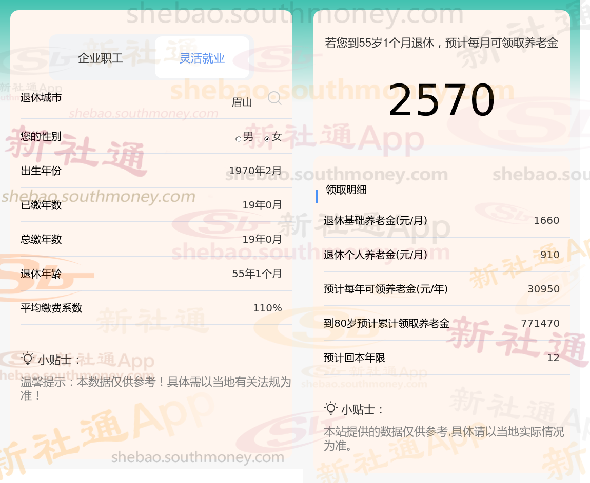 新社通app养老金计算器计算所得: