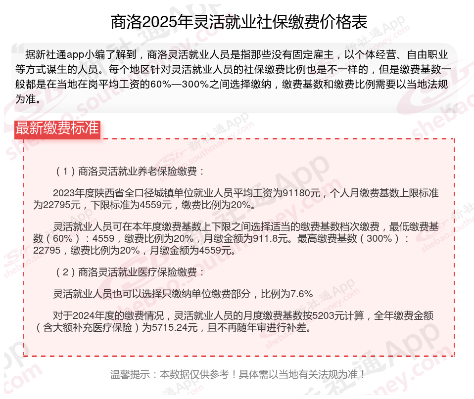 那么,商洛灵活就业人员社保一个月多少钱?根据新社通app-社保缴费查询工具提供的2025社保缴费标准详情数据: