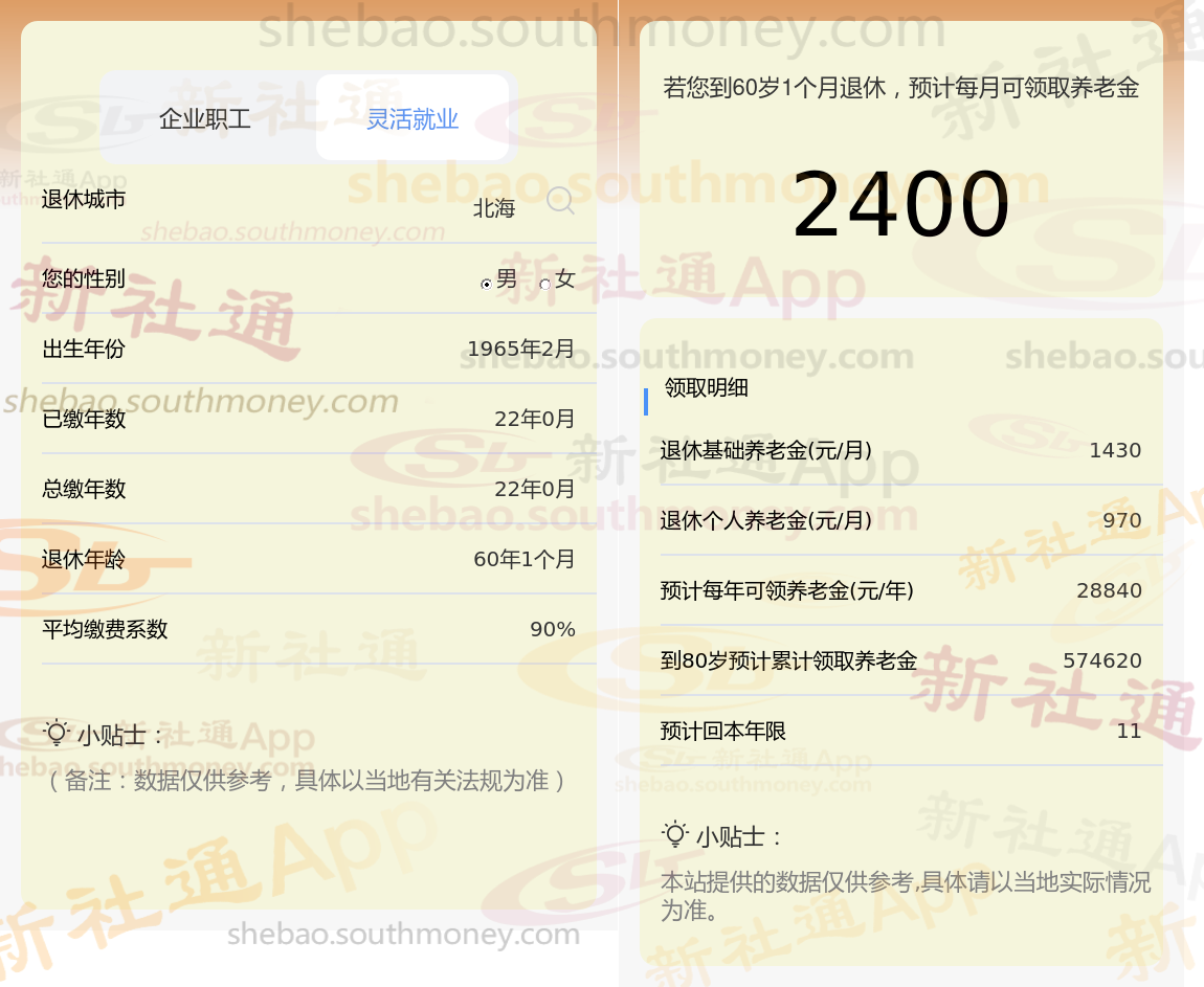 退休城市:北海,性别:男,出生年份:1965,总缴年数22年,缴费档次:90%,新社通app养老金计算器所得: