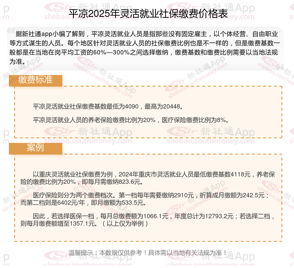 平凉灵活就业人员社保缴费基数2024-2025年最新标准是多少 灵活就业交社保划算吗?下表是2024-2025年平凉社保费用明细参考,根据新社通app-社保缴费查询工具提供的最新数据如下: