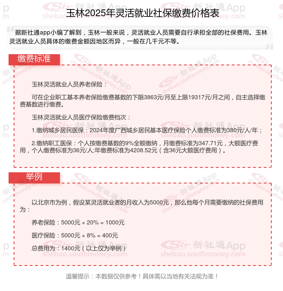 玉林灵活就业人员社保缴纳金额怎么计算?根据新社通app-社保缴费查询工具提供的最新数据如下: