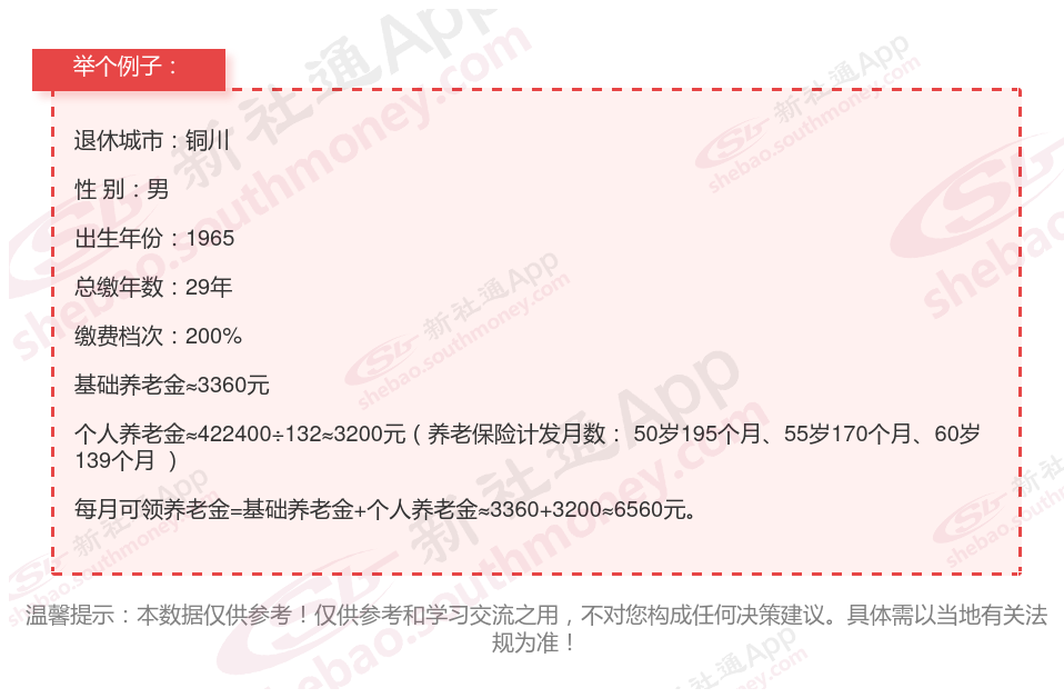 基本信息:男性,1965年出生,铜川退休,缴费年限29年,缴费档次200%。