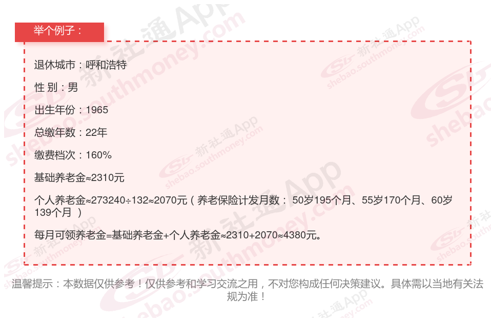 退休城市:呼和浩特,性别:男,出生年份:1965,总缴年数22年,缴费档次:160%,新社通app养老金计算器所得: