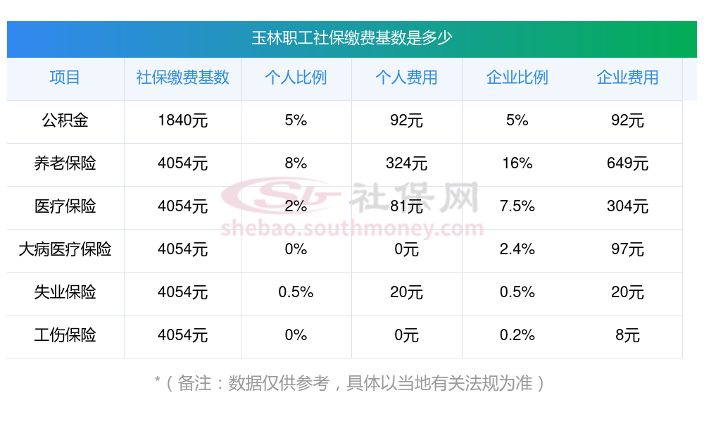 玉林社保缴纳情况是怎样的?一起和社保网小编一起来看看下面的明细表: