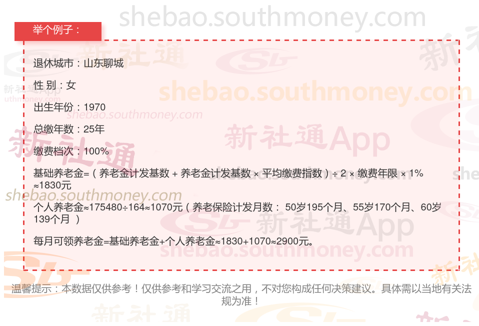 亲戚张某退休城市在山东聊城,性别:女,出生年份:1970,总缴年数25年,缴费档次:100%