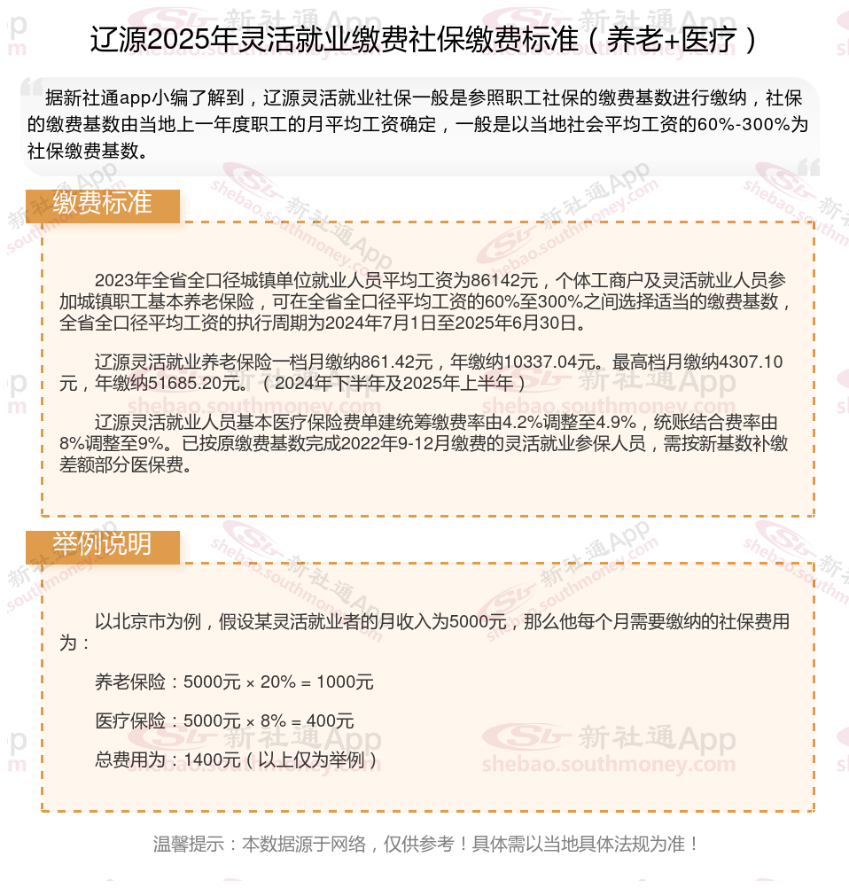 据新社通app数据显示,辽源灵活就业养老缴费基数明细如下: