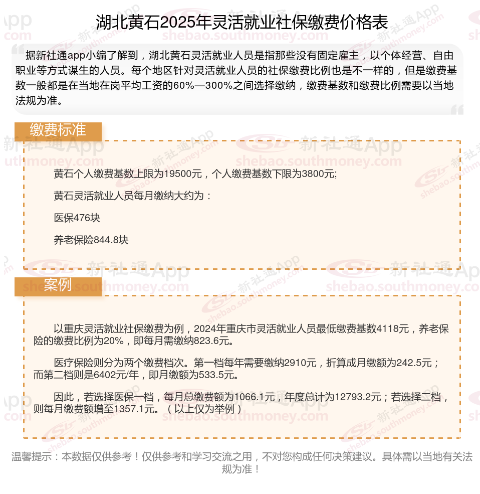 据新社通app数据显示,湖北黄石灵活就业养老保险最低缴费基数为:3800元;个人的缴费比例分别为:20%;