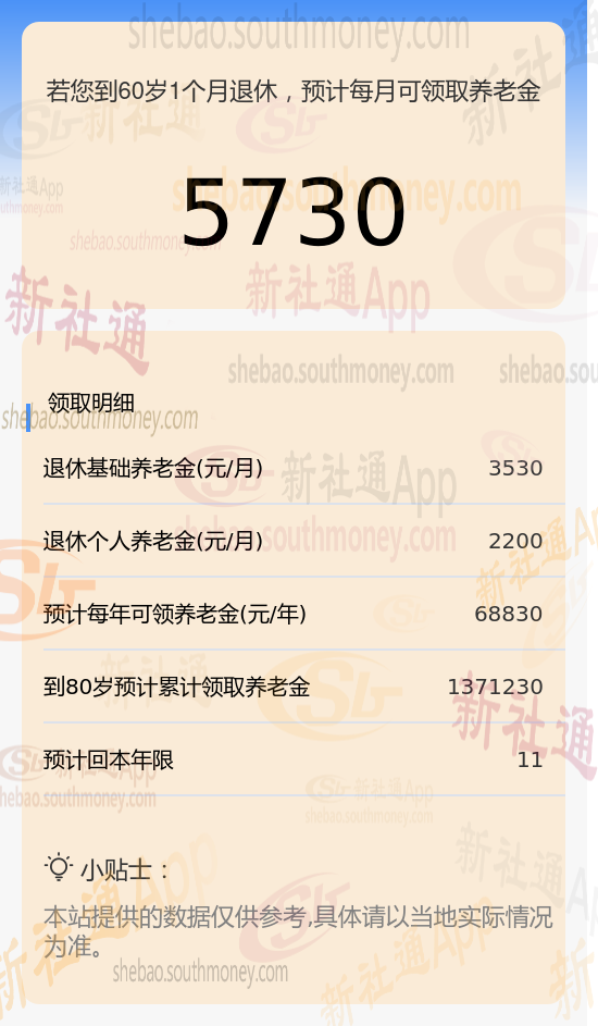 因此,希某预计每月可领取的养老金总额为基础养老金与个人养老金之和,即3530元 +2200元 = 5730元。这一估算结果由新社通app养老金计算器提供。