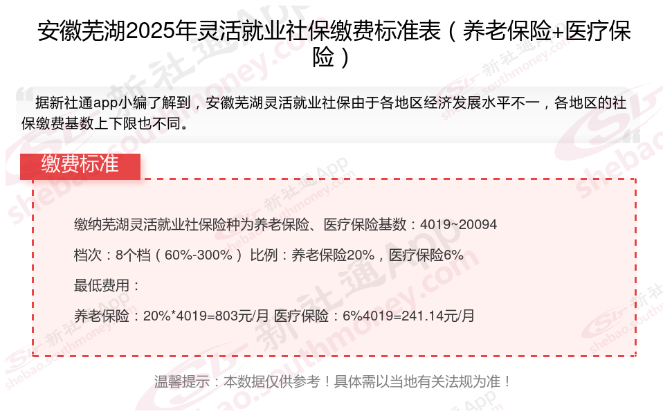 据新社通app数据显示,安徽芜湖灵活就业养老保险缴费基数2024-2025年最新标准如下: