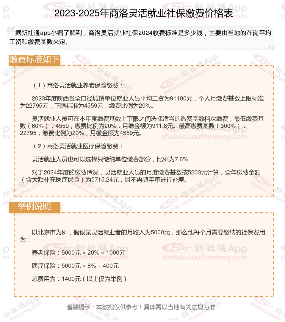 据新社通app数据显示,商洛灵活就业养老保险最低缴费基数为:4559元;个人的缴费比例分别为:20%;
