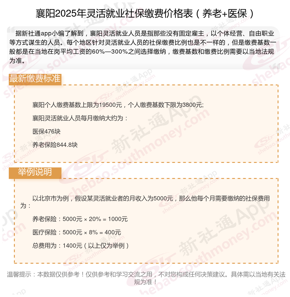 据新社通app数据显示,襄阳灵活就业养老保险缴费基数2024-2025年最新标准如下: