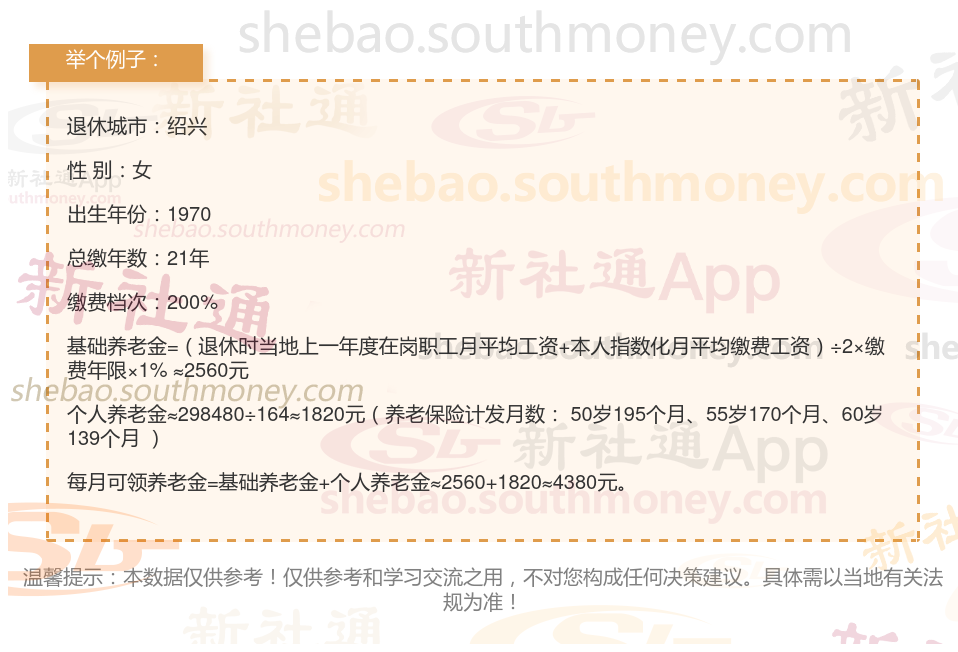 退休城市:绍兴,性别:女,出生年份:1970,总缴年数21年,缴费档次:200%