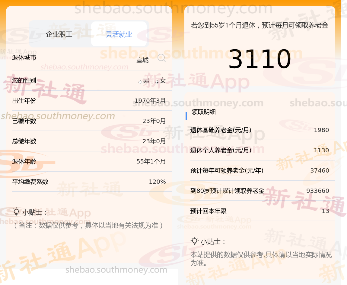 每月可领退休养老工资合计:1980+1130≈3110元。