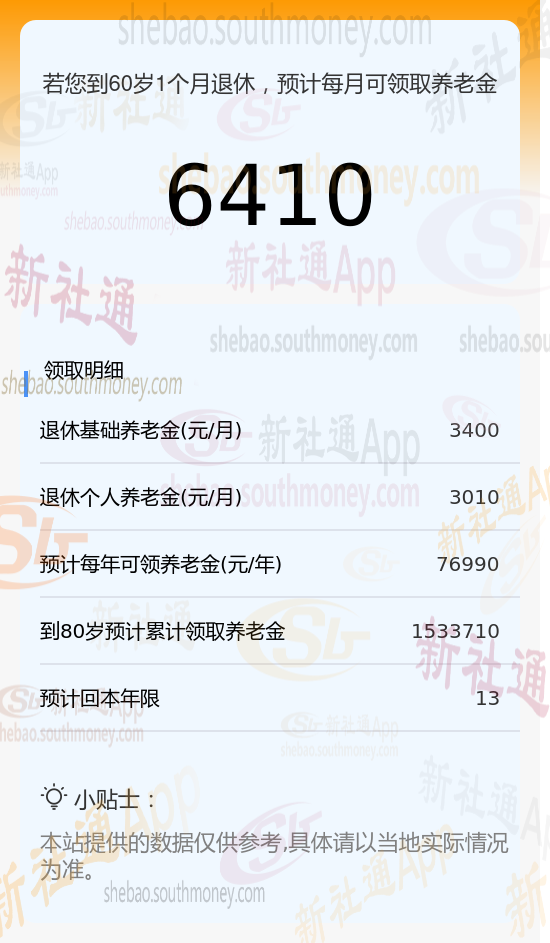 总养老金金额:两者合计,您每月可领取的养老金总额为6410元/月。