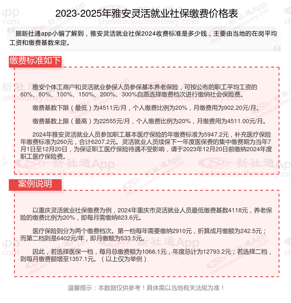 雅安灵活就业人员基本养老保险缴费基数暂按不低于4511元;