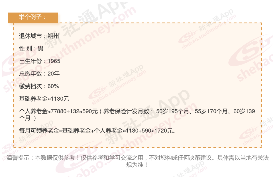 退休城市:朔州,性别:男,出生年份:1965,总缴年数20年,缴费档次:60%