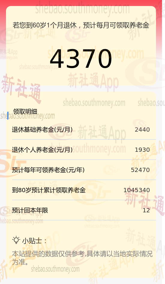 在个人养老金方面,我们则是根据秦某养老保险个人账户的累计余额,以及他退休年龄所对应的计发月数(60岁退休,计发月数为139个月)进行了估算。经过计算,我们得出他每月可以从个人账户中领取约1930元的养老金。这一数额反映了秦某个人账户的积累情况。