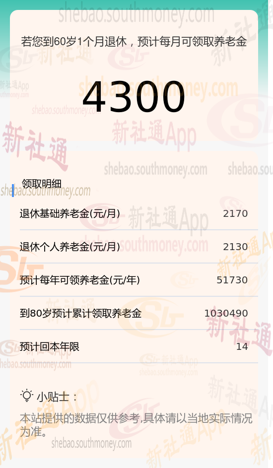 谢某,1965年出生于景德镇,是一位拥有17年社保缴费记录的退休职工,缴费档次为270%。辛勤工作多年后,他迎来了退休生活。通过新社通app养老金计算器计算所得,谢某得知自己每月可以领取到基础养老金约2170元,加上个人养老金约2130元,总计4300元。虽然金额不算多,但对于谢某来说,这是一份稳定的收入来源,为他的退休生活增添了一份安心与保证。