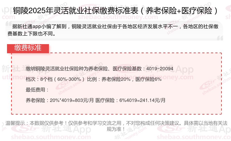据新社通app数据显示,铜陵养老保险缴费基数2024-2025年最新标准如下: