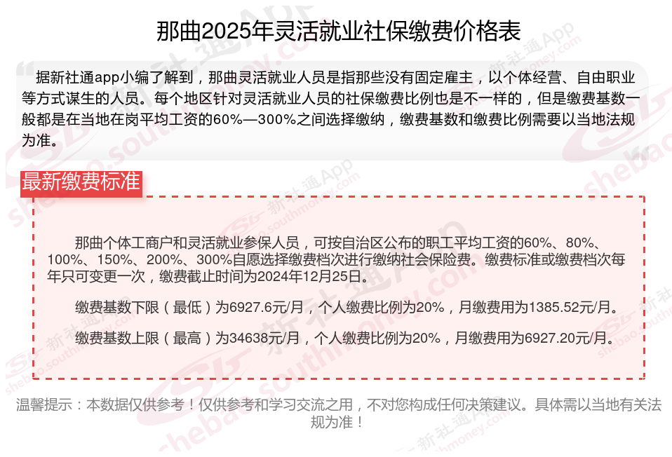 据新社通app数据显示,2024-2025年那曲灵活就业人员养老保险的缴费标准: