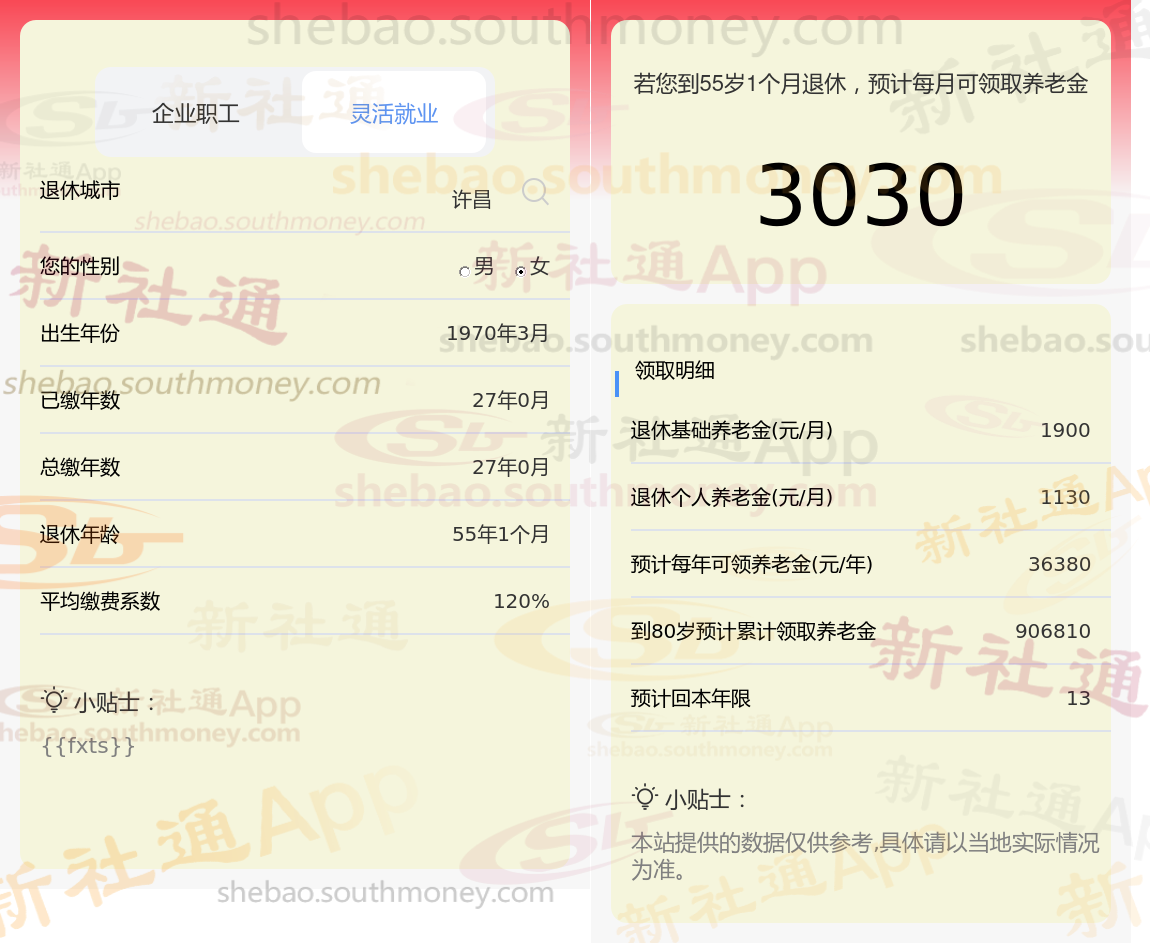 退休城市:河南许昌,性别:女,出生年份:1970,总缴年数27年,缴费档次:120%,新社通app养老金计算器所得: