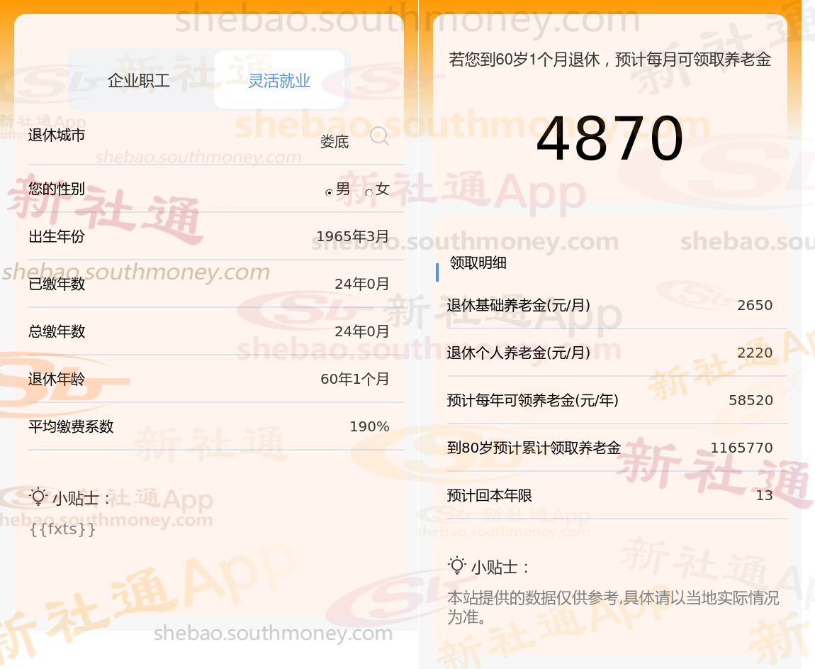 秦某,男,1965年出生,现居娄底并已退休。其养老保险缴纳情况如下:总缴费年限为24年,缴费档次达到190%。根据新社通app养老金计算器的估算结果: