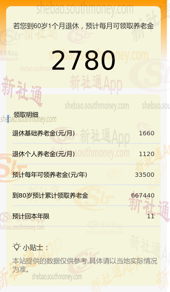 养老金总和:两者合计1660元+1120元,您每月的养老金总额为2780元。