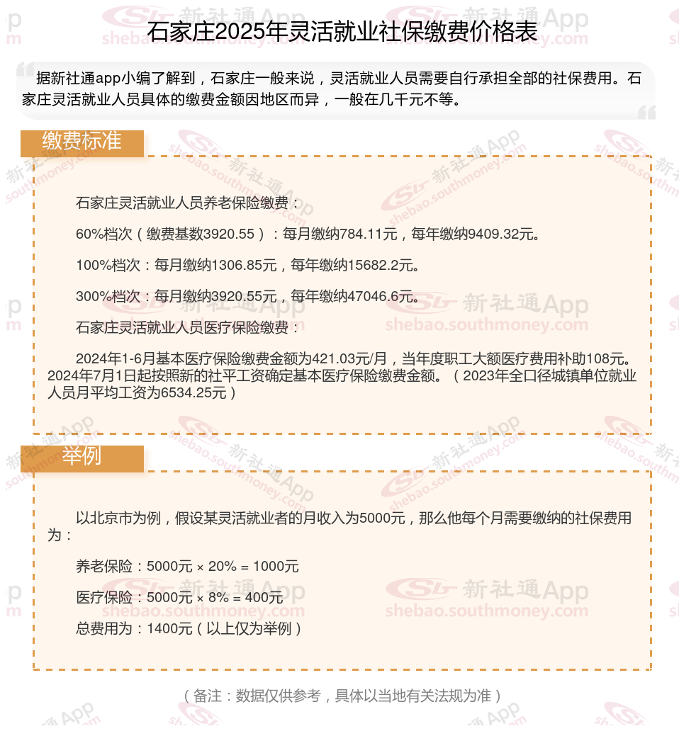 石家庄社保缴费多少钱?下表是2024-2025年石家庄社保费用明细参考,根据新社通app-社保缴费查询工具提供的最新数据如下: