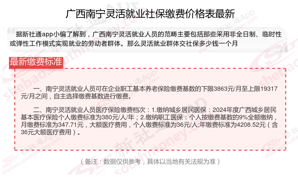 据新社通app数据显示,广西南宁灵活就业养老保险缴费基数2024-2025年最新标准如下: