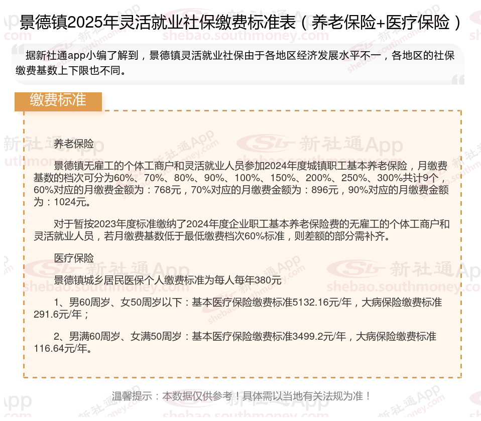 据新社通app数据显示,景德镇灵活就业人员养老缴费基数2024-2025年最新标准如下: