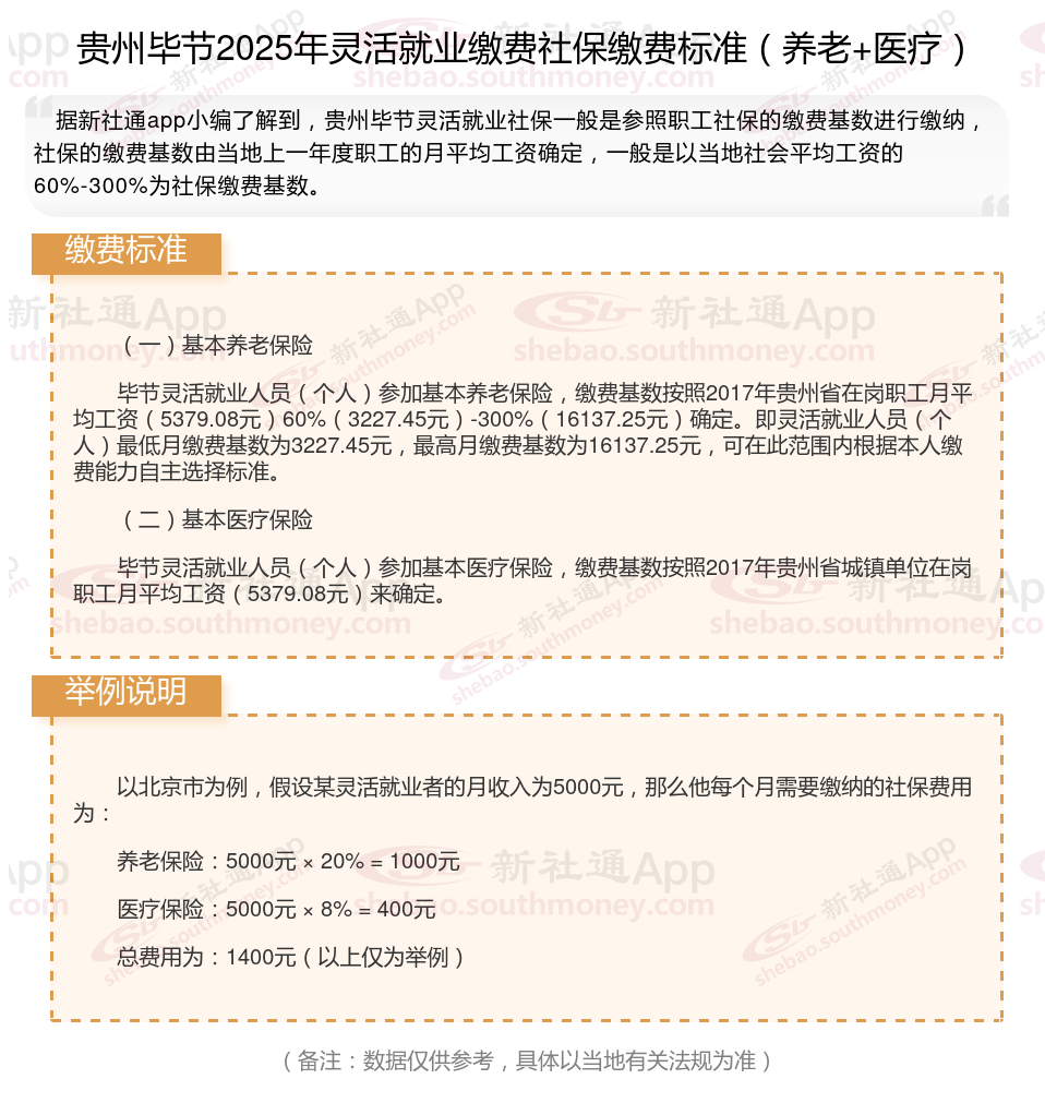 据新社通app数据显示,2024-2025年贵州毕节灵活就业人员养老保险的缴费标准是根据缴费基数来确定的: