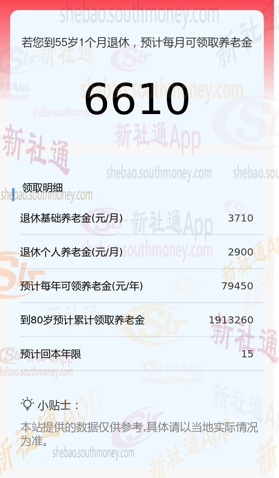 每月可领养老金总额:将基础养老金与个人养老金相加,每月可领取的养老金总额约为6610元(3710元+2900元)。