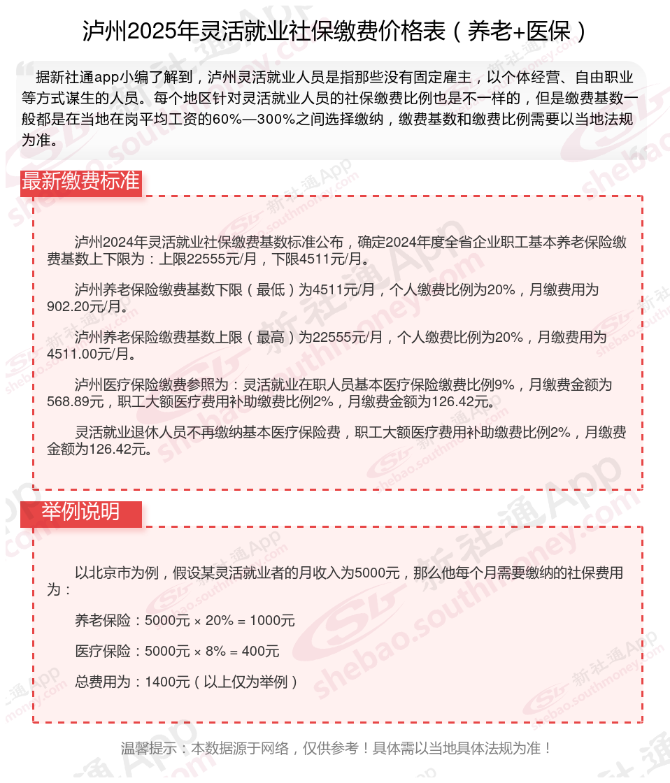 泸州社保缴费多少钱?下表是2024-2025年泸州社保费用明细参考,根据新社通app-社保缴费查询工具提供的最新数据如下: