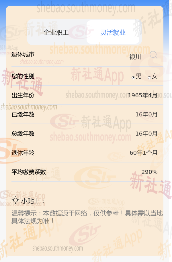 柯某是一位男性,1965年出生,现已退休。他居住的城市是银川,在职业生涯中,他累计缴纳了16年的社会保险,缴费档次为290%。