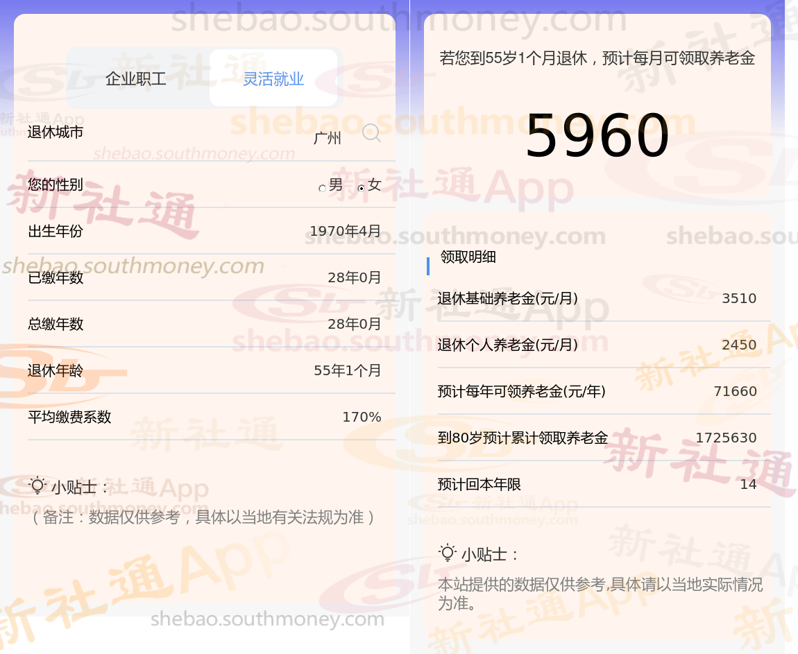 网友杨某退休城市在广东广州,性别:女,出生年份:1970,总缴年数28年,缴费档次:170%,新社通app养老金计算器所得: