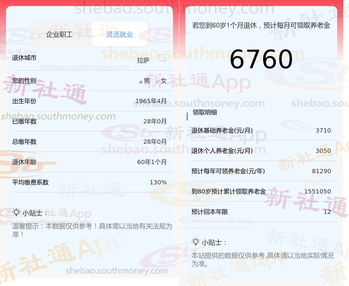 退休城市:拉萨,性别:男,出生年份:1965,总缴年数28年,缴费档次:130%,新社通app养老金计算器所得:
