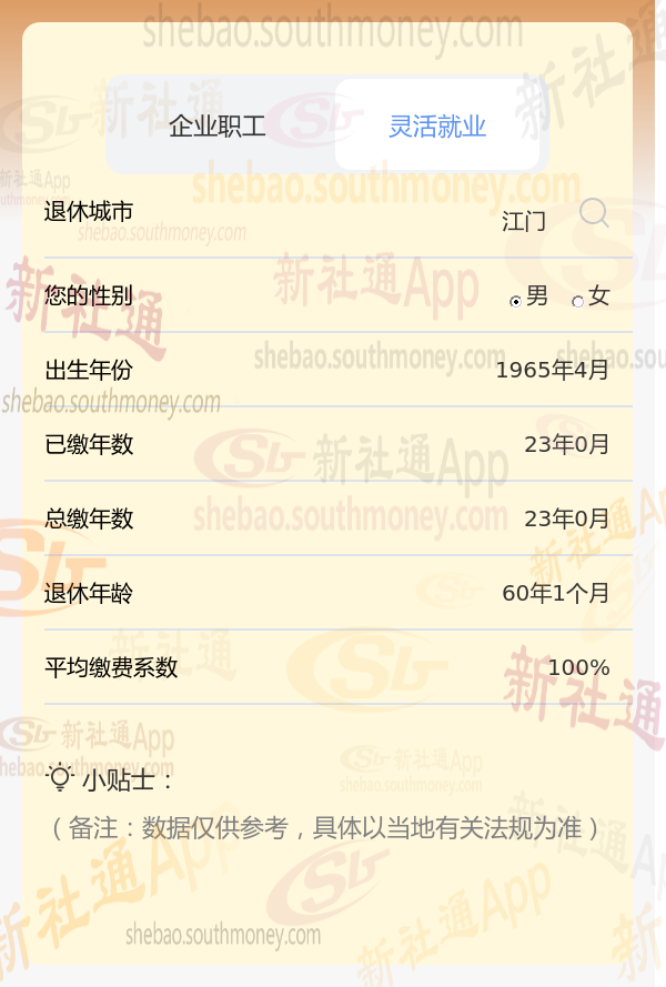 以江门1965年男性吕某为例,假设其社保缴费档次为100%缴纳社保,新社小编养老金计算器预设工资增长率等参数为3%。在此情境下,其退休后能领取的养老金数额可以通过计算器测算得出,但基于上述条件,预计数额会相对较低。为获相对准的测算结果,建议他使用新社通app养老金计算器输入个人信息进行计算,具体数额依个人情况及当地法规而定。