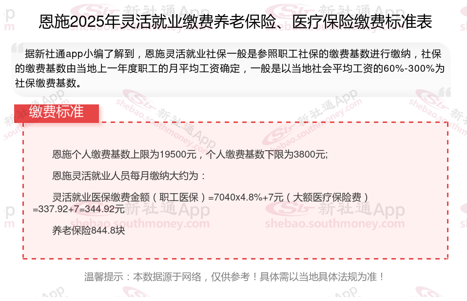 据新社通app数据显示,2024-2025年恩施灵活就业人员养老保险的缴费标准是根据缴费基数来确定的: