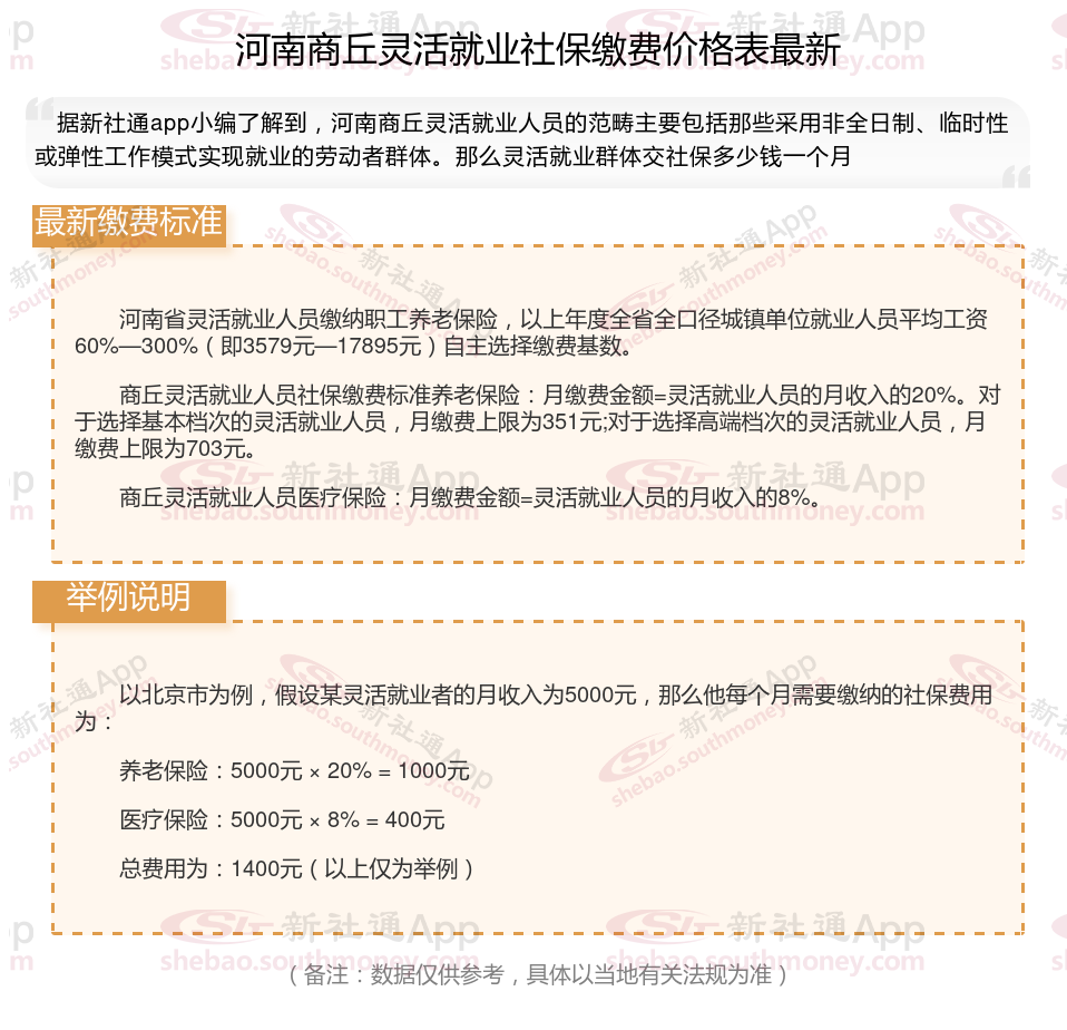 那么,河南商丘灵活就业者社保一个月多少钱?根据新社通app-社保缴费查询工具提供的2025社保缴费标准详情数据: