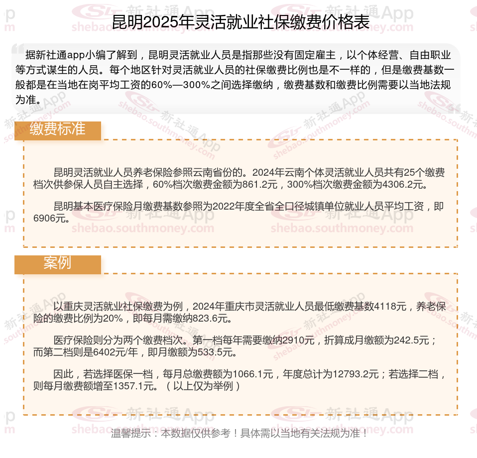 据新社通app数据显示,昆明灵活就业养老保险缴费基数2024-2025年最新标准如下:
