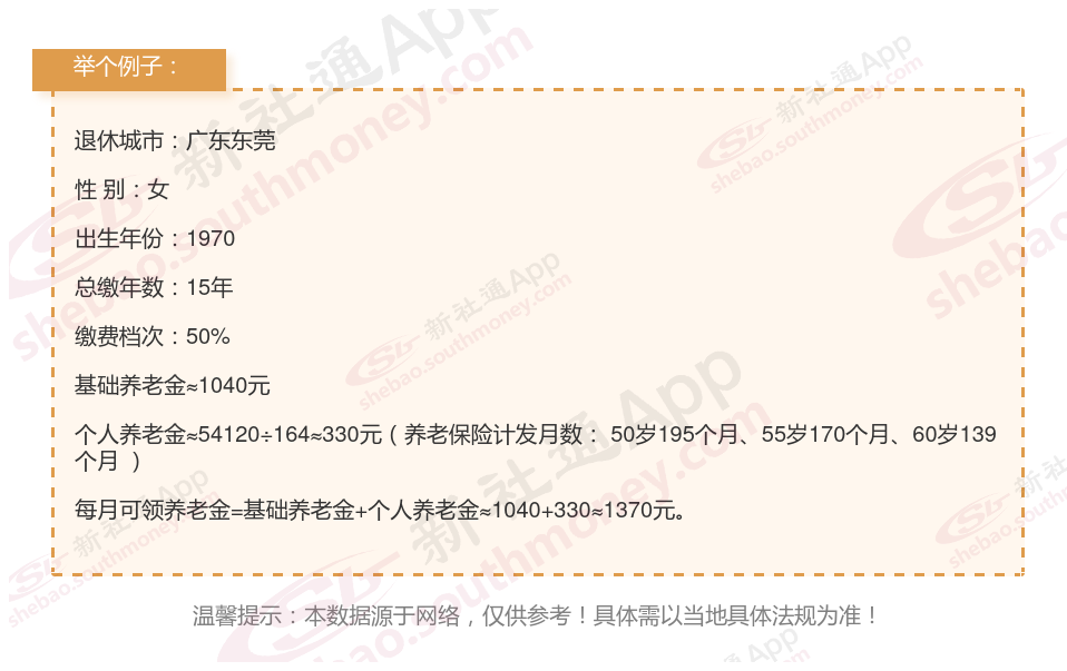 个人基础信息:女性,1970年出生,广东东莞退休人士,拥有15年的缴费年限,缴费档次为50%。