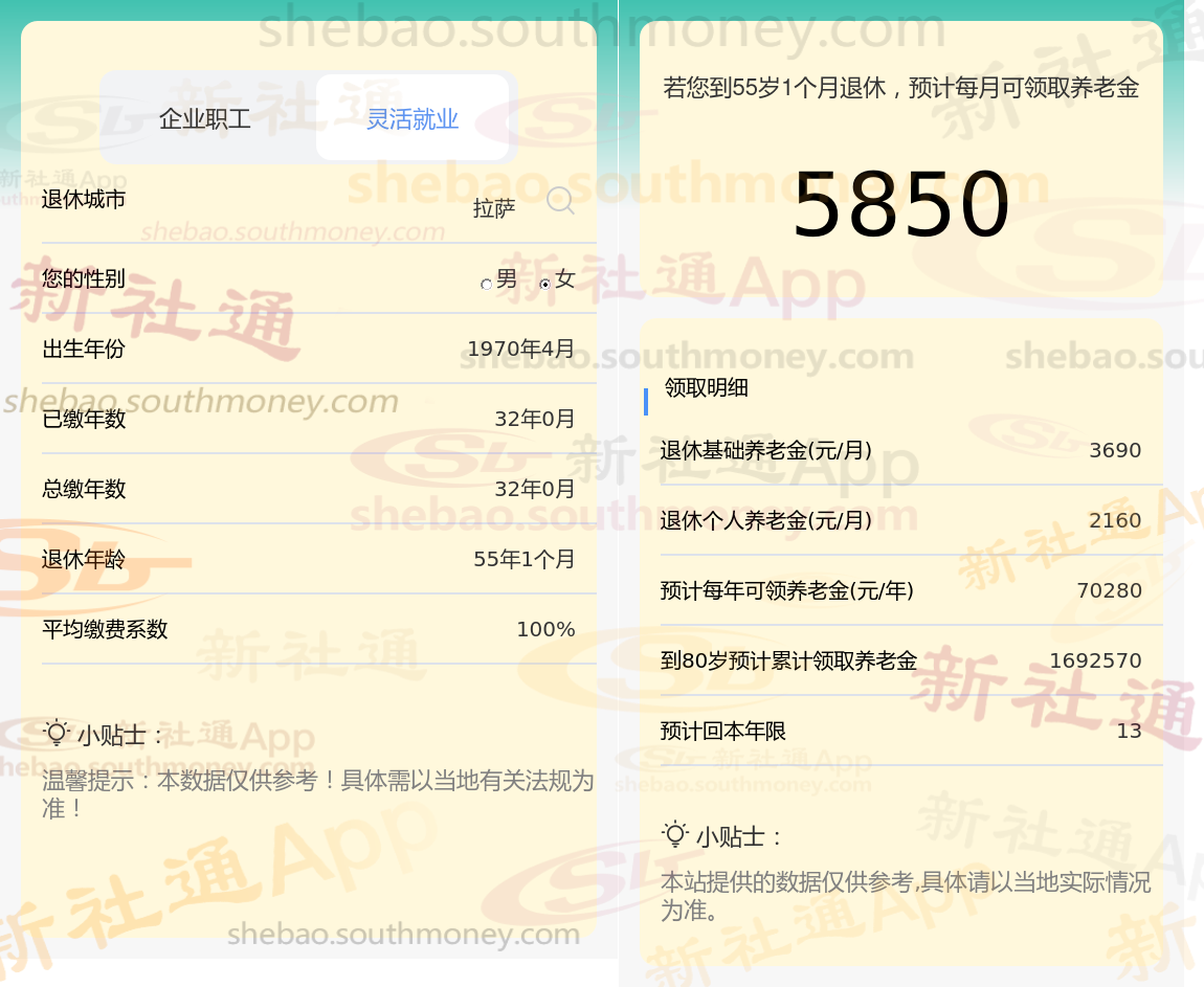 退休城市:西藏拉萨,性别:女,出生年份:1970,总缴年数32年,缴费档次:100%,新社通app养老金计算器所得: