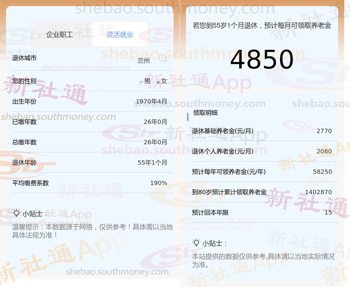 邻居吕某退休城市在兰州,性别:女,出生年份:1970,总缴年数26年,缴费档次:190%,新社通app养老金计算器所得:
