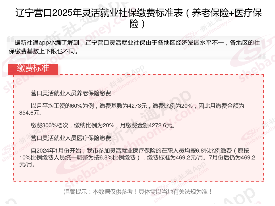 据新社通app数据显示,2024-2025年辽宁营口灵活就业人员养老保险的缴费标准是根据缴费基数来确定的: